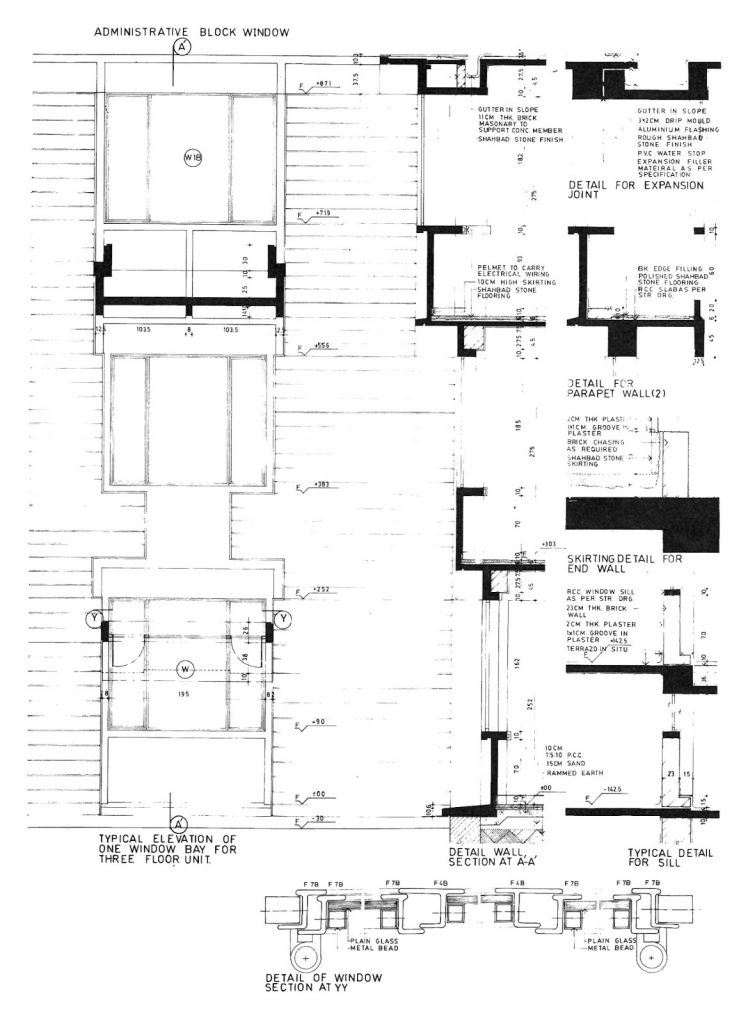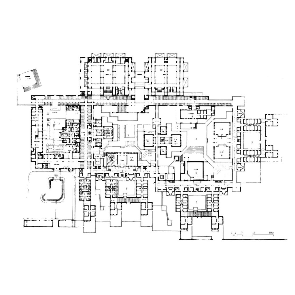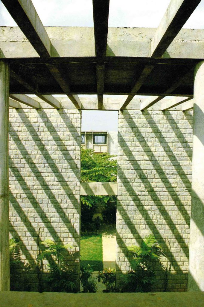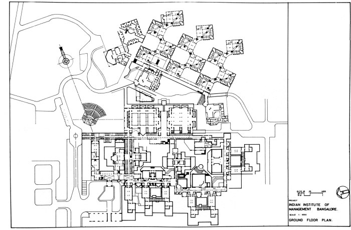 In the late 1970s, Doshi’s plan tightened up so that the academic zones were arranged around interlocking courts and terraces linked by galleries. The dormitories became angled courtyard buildings linked together by walkways and verandahs defining the pattern of indoor and outdoor spaces. The interplay of walls and openings, light and shadows, and solids and voids change the character of the main building during different times of the day and during different seasons. The width of the corridors is modulated to allow for casual seating. Access to classrooms and administrative offices is provided through these corridors.